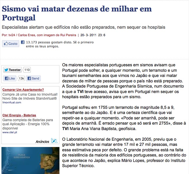 Portugal em risco de grande terramoto... e não apenas político